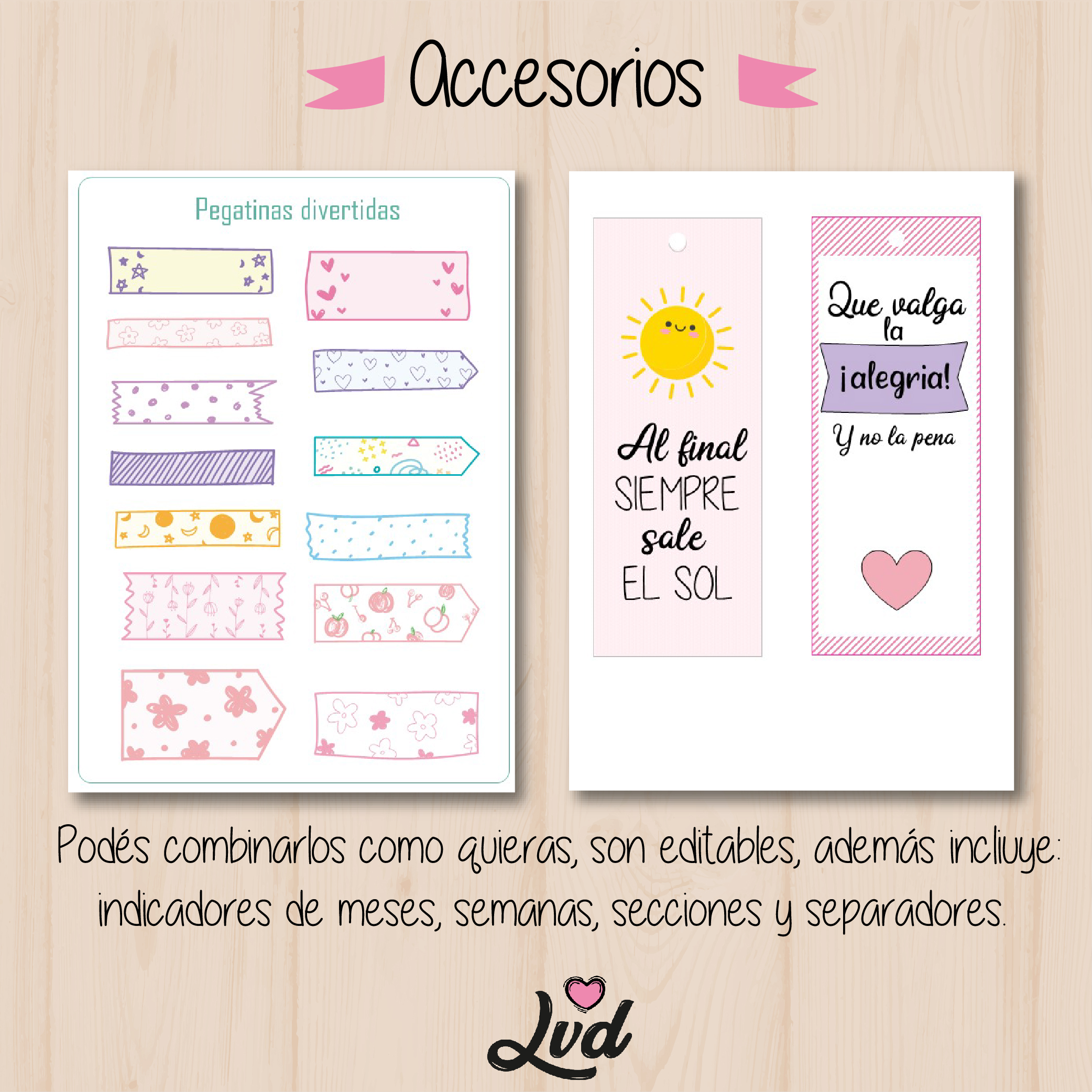 *Carpeta con accesorios para agendas: Planchas de stickers, señaladores, indicadores de lugar y separador de secciones.