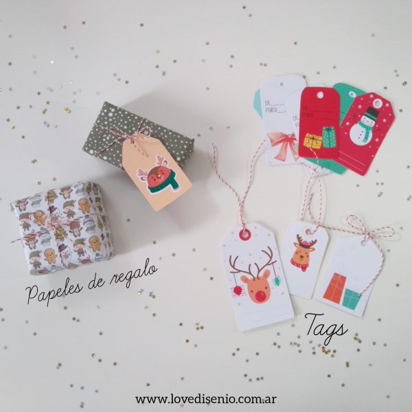 *Tags (tarjetas) y papeles de regalo A4 y A3 con motivos navideños.